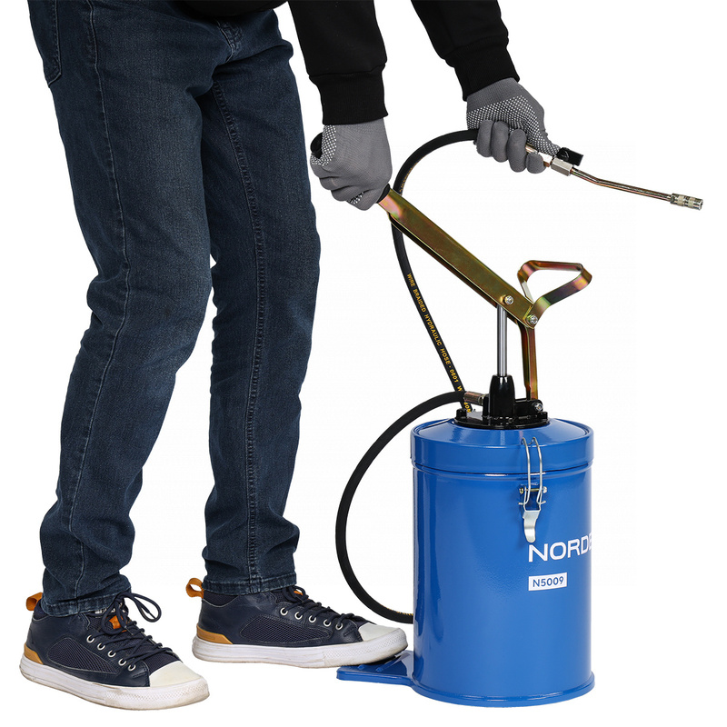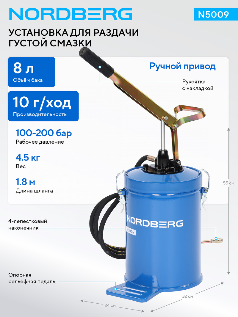 NORDBERG N5009 — надёжная и простая в использовании установка для раздачи густой смазки, сочетающая удобство ручного управления, прочную конструкцию и оптимальные рабочие характеристики. Отлично подходит для профессионального применения на СТО и в мастерских.