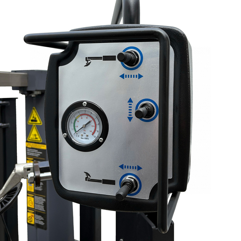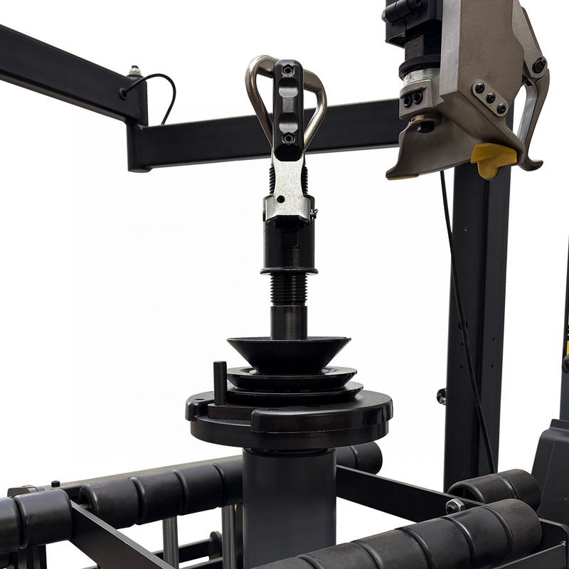 - Совмещенная система центрального зажима и лифта обеспечивает быстроту и простоту процесса размещения и центрирования колеса на фланце станка, что полностью исключает необходимость удерживать его на весу во время установки гайки;