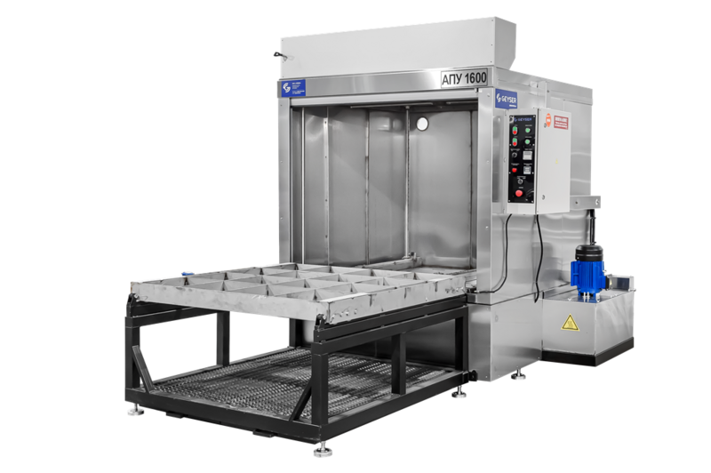 АПУ 1600 ВР - полностью автоматизированная установка струйной очистки распылением с вертикальными вращающимися рампами, открывающейся вверх шторой и выкатным рабочим столом. В АПУ 1600 ВР увеличенное моечное пространство 1600х1600х1000 мм (возможно увеличение высоты до 1300 мм) и применены вертикальные рампы.
